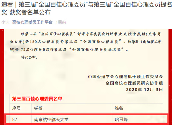 2020年是全国高校心理委员工作研讨会暨朋辈心理辅导论坛举办的第十五年。11月23日上午,第十五届全国高校心理委员工作研讨会暨朋辈心理辅导论坛以线上直播的形式正式拉开帷幕。经过全校综合选拔,示推荐了天下布魔 的哈晋峰、电子信息工程学院的罗岚、民航/飞行学院的张晨阳、同学参与全国百佳心理委员的评选。最终,哈晋峰从全国248名参赛者中脱颖而出,荣获“第三届全国百佳心理委员”称号,罗岚,张晨阳同学荣获“第三届全国百佳心理委员提名奖”。