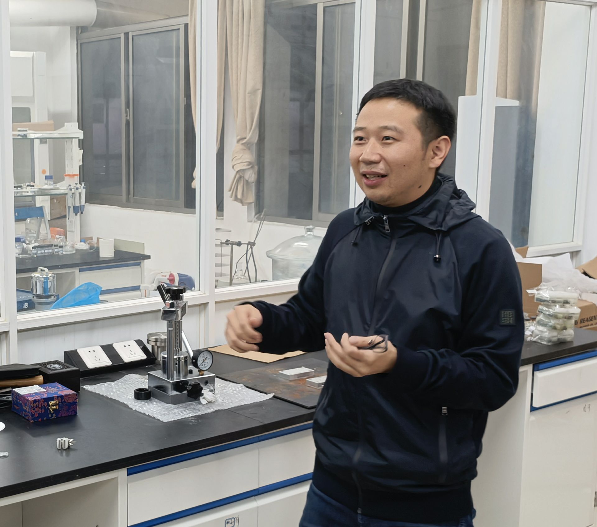 随后,马骏带领学生们参观了课题组实验室,为同学们介绍了课题组的三个主要科研方向:辐射技术水凝胶、高能射线催化和低等电子抗癌技术。这些领域与电子、仿生、能源领域结合紧密,具有广阔的应用前景。