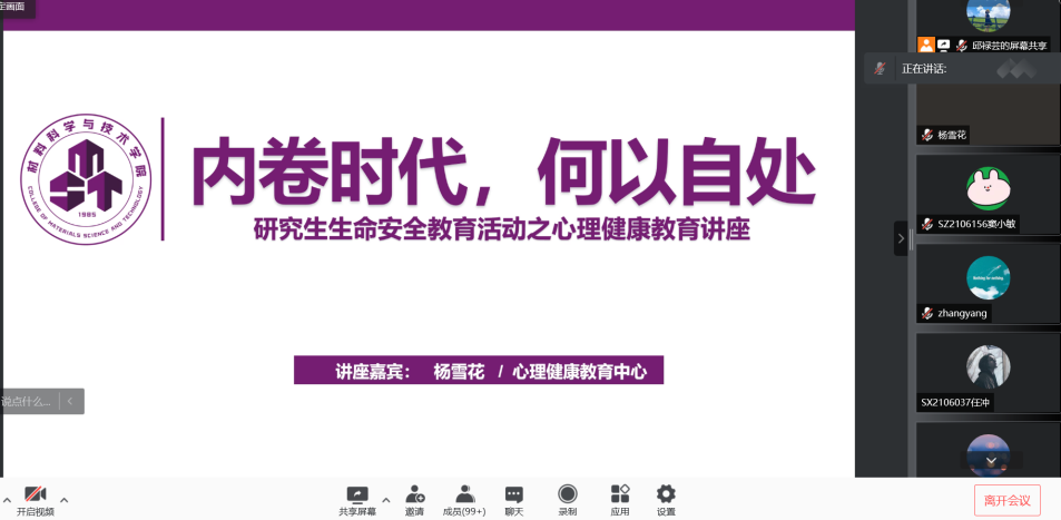 为帮助研究生新生改善心理机能,培养良好的心理品质,塑造健全的人格,学院紧密结合研究生特点及研究生培养需求,综合考虑疫情防控常态化要求,于2021年12月20日晚,开展以“内卷时代,何以自处”为主题的心理健康教育讲座。讲座邀请我校心理健康教育中心主任杨雪花任主讲嘉宾,2021级全体研究生参加。本次讲座由辅导员邱禄芸主持。