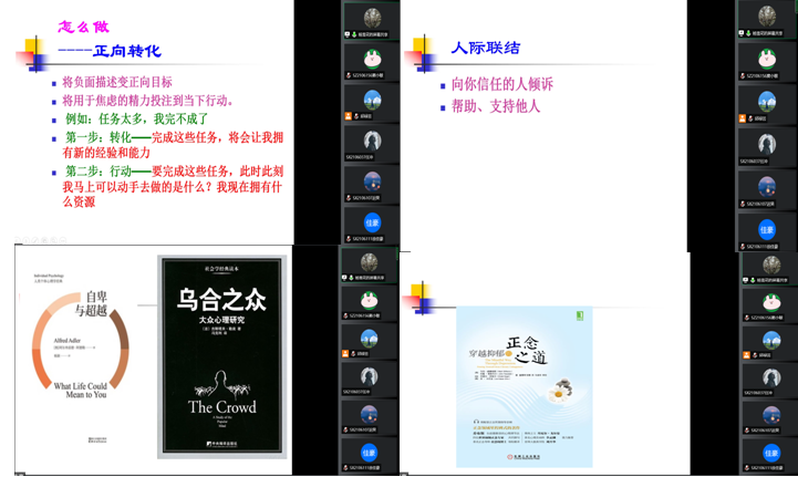 在分析了“是什么”以及“为什么”的基础上,杨雪花给出了“怎么办”的科学实用的建议。她建议同学们在察觉到压力和焦虑时,要学会使用正向转化与人际联结这两种方法,并向同学们推荐了三本心理相关的书籍,希望同学们都有一个快乐的人生。