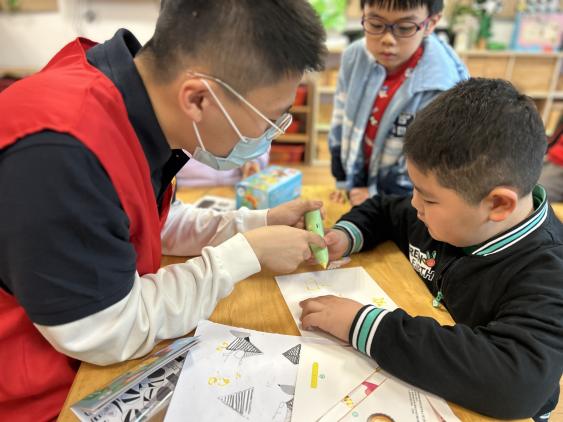 随后,激光增材制造研究生纵向党支部的同学们走进大(一)班课堂,为小朋友们带来了一堂生动有趣的科普课《3D打印,让想象更立体》。志愿者用孩子们的语言讲解3D打印的原理和应用,幼儿们拿起3D打印笔,发挥自己的想象力和创造力,描绘出一件件形象、灵动的3D打印作品,亲身感受了3D打印的乐趣和神奇,增强了大家对未知世界的好奇以及对科学真理的热爱,让航空航天的种子在幼儿心中生根发芽。