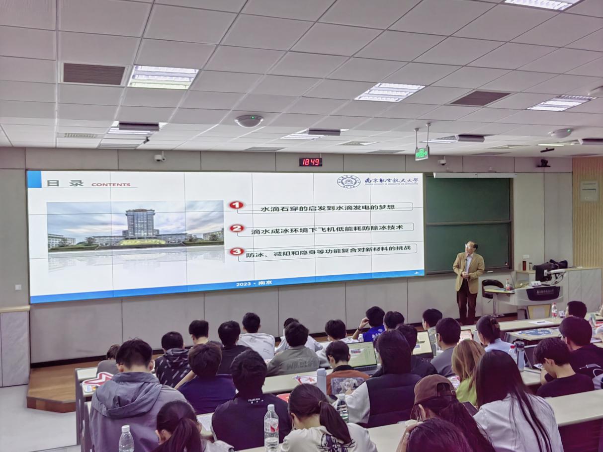 陶老师以水滴的结冰相变行为作为切入点,基于实际应用中的飞机防除冰技术,围绕国家航空航天领域的重大需求,向同学们讲述了先进防冰材料的发展动态,并引导同学们了解材料研发过程中的设计、表征与分析手段。同时,针对我国科学家,特别是南航研究团队在飞机结冰防护领域的前沿工作进行了详细的介绍。“我们为什么要学习材料专业?”,对于这个问题,同学们在认真聆听本次讲座后,已经有了清晰的答案。
