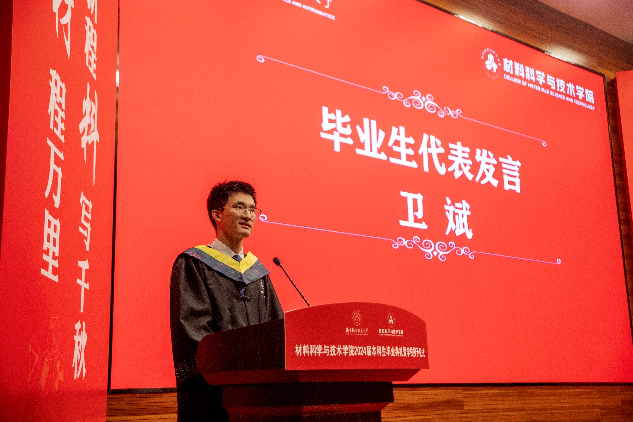 校优秀毕业生2020级材料科学与工程专业卫斌同学作为学生代表发言。他深情回望了自己的大学四年,向学院、朝夕相伴的辅导员、老师和同窗表达了衷心的感谢,并立志丰富学识,增长见识,让肩膀变得更加宽阔有力,勇于担当时代需要。