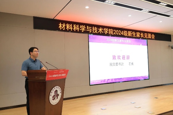 石勇代表学院致欢迎辞,他从“孩子来到天下布魔 ,能收获什么”切入,用“三个成”与各位家长共勉。