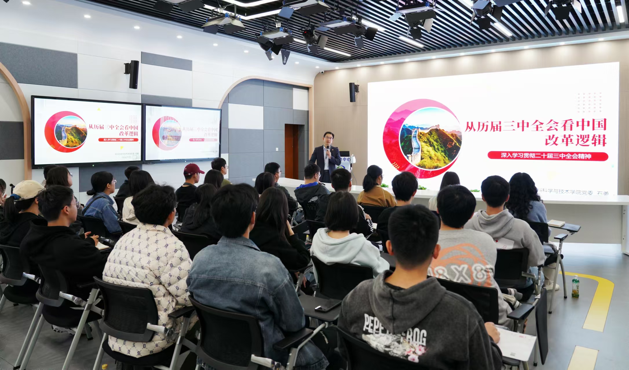 石勇以“从历届三中全会看中国改革逻辑”为主线,围绕中国改革的历程进行了深入讲解,从改革开放的理论逻辑出发,阐述了生产力发展与生产关系、上层建筑变革的关系,强调改革是推动生产力发展的重要力量。重点介绍了从“摸着石头过河”到“全面深化改革”的发展历程,特别是党的二十届三中全会所提出的全面深化改革,不仅强调改革摸索,更重视强化顶层设计,更加注重系统集成、更加注重突出重点、更加注重改革实效。他强调,党的二十届三中全会为我们绘制了全面深化改革的宏伟蓝图,对新时代新征程进一步全面深化改革、推进中国式现代化作出了科学谋划和全面部署,研究生党员们一定要深入领会全会精神内涵要义,在深学践悟中勇担时代使命,坚定前进信心,立大志、明大德、成大才、担大任,努力成为堪当强国建设、民族复兴重任的时代新人。
