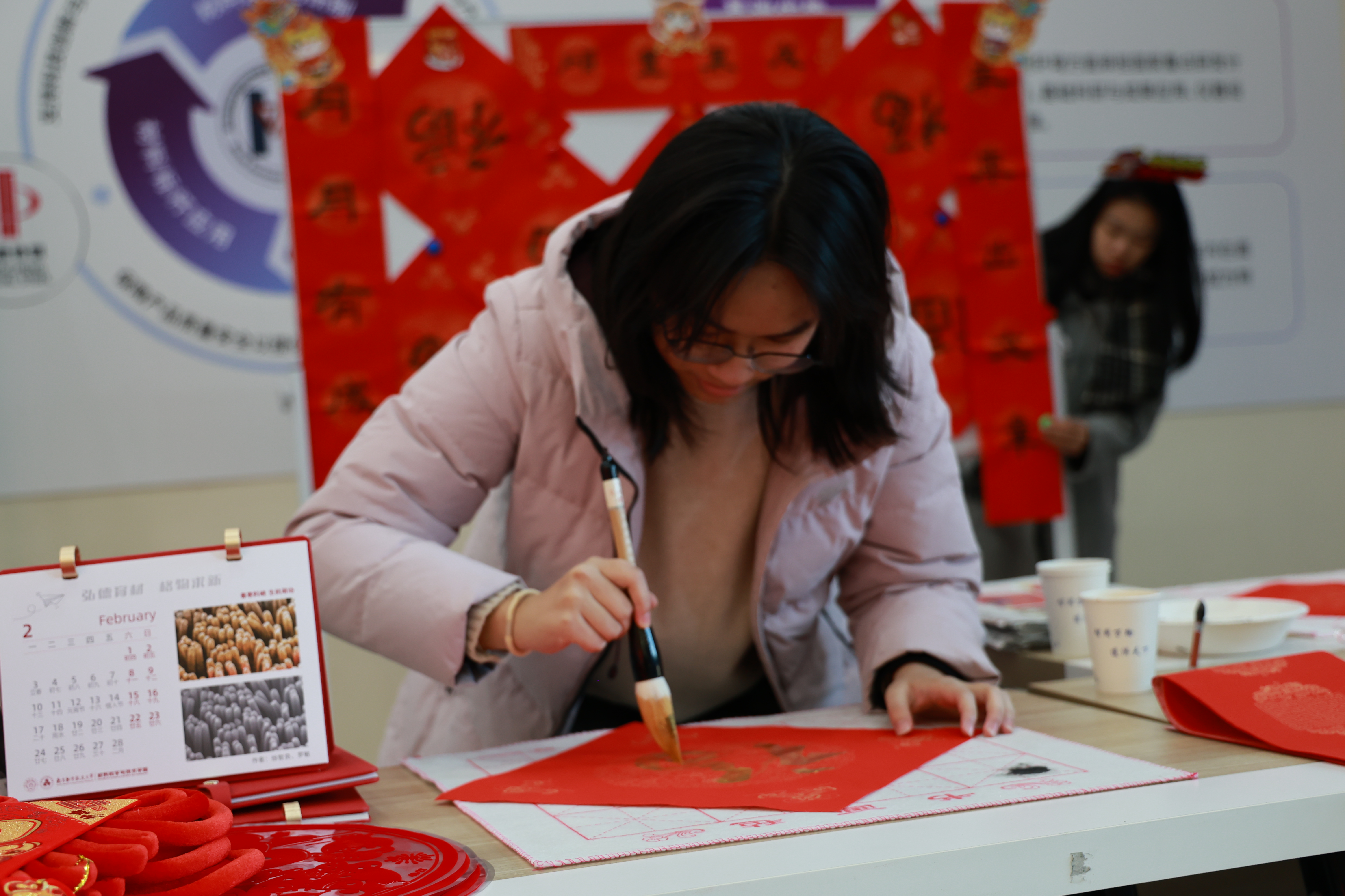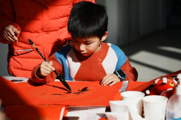 师生铺开红纸、提笔蘸墨,书写一副副寓意美好、充满祝福的春联。“龙含宝珠辞旧岁,蛇吐瑞气贺新春”“家和事顺年年好,人美心善岁岁安”“陶然自得身心健,余庆连绵岁月甜”……行云流水的书法笔触,一句句辞旧迎新的佳句跃然纸上,浸润着浓浓的年味,吸引了众多师生驻足观赏与赞叹。