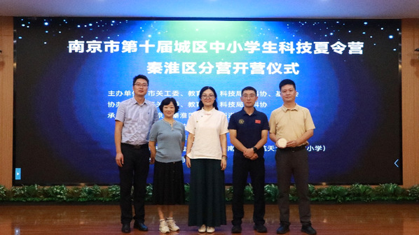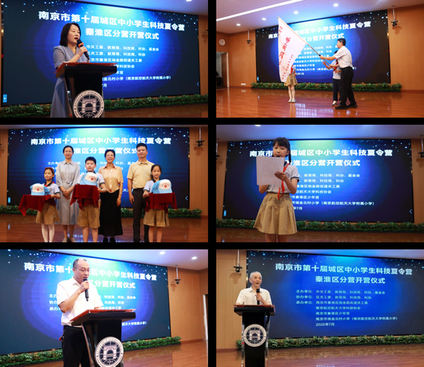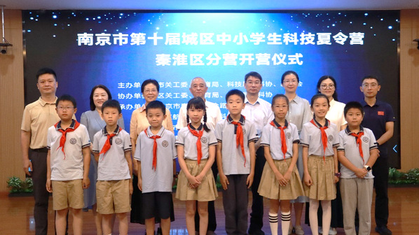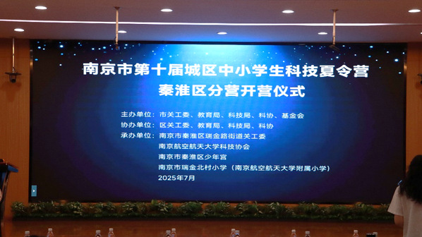 7月15日,南京市城区中小学生科技夏令营(秦淮区分营)开营仪式在瑞金北村小学隆重举行。本次活动以“探梦科技,共赴未来之约”为主题,由秦淮区关工委牵头,联合区教育局、科技局、科协及瑞金路街道共同主办,南京市瑞金北村小学、秦淮区少年宫和南京航空航天大学联合承办。